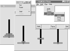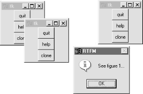 When big_gui is run as a top-level program, it creates a window with four menu pull-downs on top, and a three-button toolbar on the bottom, shown in Figure 9-3 along with some of the pop-up windows its callbacks create. The menus have separators, disabled entries, and cascading submenus, all as defined by the menuBar template. Figure 9-3. big_gui with various pop-ups