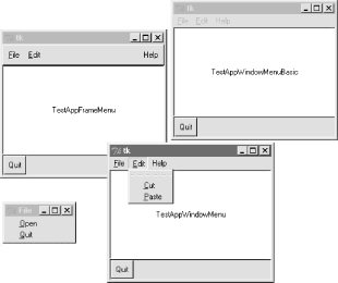 We'll see this class show up again as a mixin in later examples, too -- that's the whole point of code reuse, after all. 9.2.2 GuiMaker: Automating Menus and ToolbarsThe last section's mixin class makes common tasks simpler, but it still doesn't address the complexity of linking up widgets like menus and toolbars. Of course, if we had access to a GUI layout tool that generated Python code, this would not be an issue. We'd design our widgets interactively, press a button, and fill in the callback handler blanks. For now, a programming-based approach can work just as well. What we'd like is to be able to inherit something that does all the grunt work of construction for us, given a template for the menus and toolbars in a window. Here's one way it can be done -- using trees of simple objects. The class in Example 9-2 interprets data structure representations of menus and toolbars, and builds all the widgets automatically. Example 9-2. PP2E\Gui\Tools\guimaker.py############################################################################### # An extended Frame that makes window menus and tool-bars automatically. # Use GuiMakerFrameMenu for embedded components (makes frame-based menus). # Use GuiMakerWindowMenu for top-level windows (makes Tk8.0 window menus). # See the self-test code (and PyEdit) for an example layout tree format. ############################################################################### import sys from Tkinter import * # widget classesfrom types import * # type constants class GuiMaker(Frame): menuBar = [] # class defaults toolBar = [] # change per instance in subclasses helpButton = 1 # set these in start( ) if need self def __init__(self, parent=None): Frame.__init__(self, parent) self.pack(expand=YES, fill=BOTH) # make frame stretchable self.start( ) # for subclass: set menu/toolBar self.makeMenuBar( ) # done here: build menu-bar self.makeToolBar( ) # done here: build tool-bar self.makeWidgets( ) # for subclass: add middle part def makeMenuBar(self): """ make menu bar at the top (Tk8.0 menus below) expand=no, fill=x so same width on resize """ menubar = Frame(self, relief=RAISED, bd=2) menubar.pack(side=TOP, fill=X) for (name, key, items) in self.menuBar:mbutton = Menubutton(menubar, text=name, underline=key) mbutton.pack(side=LEFT) pulldown = Menu(mbutton) self.addMenuItems(pulldown, items) mbutton.config(menu=pulldown) if self.helpButton: Button(menubar, text = 'Help', cursor = 'gumby', relief = FLAT, command = self.help).pack(side=RIGHT) def addMenuItems(self, menu, items):for item in items: # scan nested items list if item == 'separator': # string: add separator menu.add_separator({})elif type(item) == ListType: # list: disabled item list for num in item: menu.entryconfig(num, state=DISABLED) elif type(item[2]) != ListType:menu.add_command(label = item[0], # command: underline = item[1], # add command command = item[2]) # cmd=callable else: pullover = Menu(menu)self.addMenuItems(pullover, item[2]) # sublist: menu.add_cascade(label = item[0], # make submenu underline = item[1], # add cascade menu = pullover) def makeToolBar(self): """ make button bar at bottom, if anyexpand=no, fill=x so same width on resize """ if self.toolBar: toolbar = Frame(self, cursor='hand2', relief=SUNKEN, bd=2) toolbar.pack(side=BOTTOM, fill=X) for (name, action, where) in self.toolBar: Button(toolbar, text=name, command=action).pack(where) def makeWidgets(self): """ make 'middle' part last, so menu/toolbar is always on top/bottom and clipped last; override this default, pack middle any side;for grid: grid middle part in a packed frame """ name = Label(self, width=40, height=10,relief=SUNKEN, bg='white', text = self.__class__.__name__, cursor = 'crosshair') name.pack(expand=YES, fill=BOTH, side=TOP) def help(self): """ override me in subclass """ from tkMessageBox import showinfo showinfo('Help', 'Sorry, no help for ' + self.__class__.__name__)def start(self): pass # override me in subclass ############################################################################### # For Tk 8.0 main window menubar, instead of a frame ############################################################################### GuiMakerFrameMenu = GuiMaker # use this for embedded component menusclass GuiMakerWindowMenu(GuiMaker): # use this for top-level window menus def makeMenuBar(self): menubar = Menu(self.master) self.master.config(menu=menubar) for (name, key, items) in self.menuBar: pulldown = Menu(menubar) self.addMenuItems(pulldown, items) menubar.add_cascade(label=name, underline=key, menu=pulldown) if self.helpButton: if sys.platform[:3] == 'win': menubar.add_command(label='Help', command=self.help) else:pulldown = Menu(menubar) # linux needs real pulldown pulldown.add_command(label='About', command=self.help) menubar.add_cascade(label='Help', menu=pulldown)############################################################################### # Self test when file run stand-alone: 'python guimaker.py' ############################################################################### if __name__ == '__main__': from guimixin import GuiMixin # mixin a help method menuBar = [ ('File', 0, [('Open', 0, lambda:0), # lambda:0 is a no-op ('Quit', 0, sys.exit)]), # use sys, no self here ('Edit', 0,[('Cut', 0, lambda:0), ('Paste', 0, lambda:0)]) ] toolBar = [('Quit', sys.exit, {'side': LEFT})] class TestAppFrameMenu(GuiMixin, GuiMakerFrameMenu): def start(self): self.menuBar = menuBar self.toolBar = toolBar class TestAppWindowMenu(GuiMixin, GuiMakerWindowMenu): def start(self): self.menuBar = menuBar self.toolBar = toolBar class TestAppWindowMenuBasic(GuiMakerWindowMenu): def start(self): self.menuBar = menuBarself.toolBar = toolBar # guimaker help, not guimixin root = Tk( ) TestAppFrameMenu(Toplevel( )) TestAppWindowMenu(Toplevel( )) TestAppWindowMenuBasic(root)root.mainloop( ) To make sense of this module, you have to be familiar with the menu fundamentals introduced in the last chapter. If you are, though, it's straightforw
