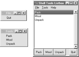 To find this demo, the script searches directory trees on your machine rooted at common places; it was found on mine only by a last-resort traversal of my entire C: hard drive: C:\...\PP2E\Gui\Tools\BigGui>python big_gui.py Searching for standard demos on your machine... Searching for hanoi.py in C:\Program Files\Python Searching for hanoi.py in C:\PP2ndEd\examples\PP2E\Gui\Tools\BigGui Searching for hanoi.py in C:\Program Files Searching for hanoi.py in C:\ Using demo dir: C:\PP2ndEd\cdrom\Python1.5.2\SourceDistribution\Unpacked\Python- 1.5.2\Demo\tkinter C:\PP2ndEd\cdrom\Python1.5.2\SourceDistribution\Unpacked\Python-1.5.2\Demo\tkint er\guido\hanoi.py This search takes about 20 seconds on my 650 MHz Windows laptop, but is done only the first time you select one of these demos -- after a successful search, the find_demo_dir module caches away the directory name in a global variable for immediate retrieval the next time you start a demo. If you want to run demos from other directories (e.g., one of the book demos in the PP2E tree), select the Play menu's Other option to pop up a standard file selection dialog instead and navigate to the desired program's file. Finally, I should note that GuiMaker can be redesigned to use trees of embedded class instances that know how to apply themselves to the Tkinter widget tree being constructed, instead of branching on the types of items in template data structures. In the interest of space, though, we'll banish that extension to the land of suggested exercises in this edition. 9.2.4 ShellGui: Adding GUIs to Command-Line ToolsTo better show how things like the GuiMixin class can be of practical use, we need a more realistic application. Here's one: in Chapter 4, we saw simple scripts for packing and unpacking text files (see Section 4.5). The packapp.py script we met there, you'll recall, concatenates multiple text files into a single file, and unpackapp.py extracts the original files from the combined file. We ran these scripts in that chapter with manually typed command lines that weren't the most complex ever devised, but were complicated enough to be easily forgotten. Rather than requiring users of such tools to type cryptic commands at a shell, why not also provide an easy-to-use Tkinter GUI interface for running such programs? While we're at it, why not generalize the whole notion of running command-line tools from a GUI, to make it easy to support future tools, too? 9.2.4.1 A generic shell-tools displayExamples Example 9-5 through Example 9-8 are one concrete implementation of these artificially rhetorical musings. Because I wanted this to be a general-purpose tool that could run any command-line program, its design is factored into modules that become more application-specific as we go lower in the software hierarchy. At the top, things are about as generic as they can be, as shown in Example 9-5. Example 9-5. PP2E\Gui\ShellGui\shellgui.py.py#!/usr/local/bin/python ##################################################################### # tools launcher; uses guimaker templates, guimixin std quit dialog; # I am just a class library: run mytools script to display the gui; ##################################################################### from Tkinter import * # get widgetsfrom PP2E.Gui.Tools.guimixin import GuiMixin # get quit, not donefrom PP2E.Gui.Tools.guimaker import * # menu/toolbar builderclass ShellGui(GuiMixin, GuiMakerWindowMenu): # a frame + maker + mixinsdef start(self): # use GuiMaker if component self.setMenuBar( ) self.setToolBar( ) self.master.title("Shell Tools Listbox") self.master.iconname("Shell Tools")def handleList(self, event): # on listbox double-click label = self.listbox.get(ACTIVE) # fetch selection text self.runCommand(label) # and call action here def makeWidgets(self): # add listbox in middle sbar = Scrollbar(self) # cross link sbar, list list = Listbox(self, bg='white') # or use Tour.ScrolledList sbar.config(command=list.yview) list.config(yscrollcommand=sbar.set)sbar.pack(side=RIGHT, fill=Y) # pack 1st=clip last list.pack(side=LEFT, expand=YES, fill=BOTH) # list clipped first for (label, action) in self.fetchCommands( ): # add to list-box list.insert(END, label) # and menu/toolbars list.bind('<Double-1>', self.handleList) # set event handler self.listbox = list def forToolBar(self, label): # put on toolbar? return 1 # default = all def setToolBar(self): self.toolBar = []for (label, action) in self.fetchCommands( ): if self.forToolBar(label): self.toolBar.append((label, action, {'side': LEFT})) self.toolBar.append(('Quit', self.quit, {'side': RIGHT})) def setMenuBar(self):toolEntries = [] self.menuBar = [ ('File', 0, [('Quit', -1, self.quit)]), # pull-down name ('Tools', 0, toolEntries) # menu items list ] # label,underline,action for (label, action) in self.fetchCommands( ): toolEntries.append((label, -1, action)) # add app items to menu ################################################### # delegate to template type-specific subclasses # which delegate to app toolset-specific subclasses ################################################### class ListMenuGui(ShellGui): def fetchCommands(self): # subclass: set 'myMenu' return self.myMenu # list of (label, callback) def runCommand(self, cmd):for (label, action) in self.myMenu: if label == cmd: action( ) class DictMenuGui(ShellGui): def fetchCommands(self): return self.myMenu.items( ) def runCommand(self, cmd): self.myMenu[cmd]( ) The ShellGui class in this module knows how to use the GuiMaker and GuiMix interfaces to construct a selection window that displays tool names in menus, a scrolled list, and a toolbar. It also provides an overridable forToolBar method that allows subclasses to specify which tools should and should not be added to the window's toolbar (the toolbar can get crowded in a hurry). However, it is deliberately ignorant about both the names of tools that should be displayed in those places, and the actions to be run when tool names are selected. Inste