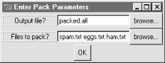 9.2.4.3 Adding GUI frontends to command linesThe callback actions named within the prior module's classes, though, should normally do something GUI-oriented. Because the original file packing and unpacking scripts live in the world of text-based streams, we need to code wrappers around them that accept input parameters from more GUI-minded users. The module in Example 9-7 uses the custom modal dialog techniques we studied in Chapter 7, to pop up an input display to collect pack script parameters. Its runPackDialog function is the actual callback handler invoked when tool names are selected in the main ShellGui window. Example 9-7. PP2E\Gui\ShellGui\packdlg.py.# added file select dialogs, empties test; could use grids import string from glob import glob # filename expansionfrom Tkinter import * # gui widget stufffrom tkFileDialog import * # file selector dialogfrom PP2E.System.App.Clients.packapp import PackApp # use pack classdef runPackDialog( ):s1, s2 = StringVar(), StringVar( ) # run class like a function PackDialog(s1, s2) # pop-up dialog: sets s1/s2 output, patterns = s1.get(), s2.get( ) # whether 'ok' or wm-destroy if output != "" and patterns != "": patterns = string.split(patterns) filenames = []for sublist in map(glob, patterns): # do expansion manually filenames = filenames + sublist # Unix does auto on command-line print 'PackApp:', output, filenamesapp = PackApp(ofile=output) # run with redirected output app.args = filenames # reset cmdline args list app.main( ) # should show msgs in gui too class PackDialog(Toplevel): def __init__(self, target1, target2):Toplevel.__init__(self) # a new top-level window self.title('Enter Pack Parameters') # 2 frames plus a button f1 = Frame(self) l1 = Label(f1, text='Output file?', relief=RIDGE, width=15) e1 = Entry(f1, relief=SUNKEN) b1 = Button(f1, text='browse...') f1.pack(fill=X) l1.pack(side=LEFT) e1.pack(side=LEFT, expand=YES, fill=X) b1.pack(side=RIGHT)b1.config(command= (lambda x=target1: x.set(askopenfilename( ))) ) f2 = Frame(self)l2 = Label(f2, text='Files to pack?', relief=RIDGE, width=15) e2 = Entry(f2, relief=SUNKEN) b2 = Button(f2, text='browse...') f2.pack(fill=X) l2.pack(side=LEFT) e2.pack(side=LEFT, expand=YES, fill=X) b2.pack(side=RIGHT) b2.config(command=(lambda x=target2: x.set(x.get() +' '+ askopenfilename( ))) ) Button(self, text='OK', command=self.destroy).pack( ) e1.config(textvariable=target1) e2.config(textvariable=target2)self.grab_set( ) # make myself modal: self.focus_set( ) # mouse grab, keyboard focus, wait... self.wait_window( ) # till destroy; else returns to caller now if __name__ == '__main__': root = Tk( ) Button(root, text='pop', command=runPackDialog).pack(fill=X) Button(root, text='bye', command=root.quit).pack(fill=X) root.mainloop( ) When run, this script makes the input form shown in Figure 9-6. Users may either type input and output filenames into the entry fields, or press the "browse..." buttons to pop up standard file selection dialogs. They can also enter filename patterns -- the manual glob.glob call in this script expands filename patterns to match names and filters out nonexistent input filenames. The Unix command line does this pattern expansion automatically when running PackApp from a shell, but Windows does not (see Chapter 2, for more details). Figure 9-6. The packdlg input form