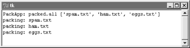 9.2.5.1 Using redirection for the packing scriptsNow, to use such redirection tools to map command-line script output back to a GUI, simply run calls and command lines with the two redirected functions in this module. Example 9-10 shows one way to wrap the packing operation to force its printed output to appear in a pop-up window when generated, instead of the console. Example 9-10. PP2E\Gui\ShellGui\packdlg-redirect.py# wrap command-line script in GUI redirection tool to popup its output from Tkinter import * from packdlg import runPackDialog from PP2E.Gui.Tools.guiStreams import redirectedGuiFunc def runPackDialog_Wrapped( ):redirectedGuiFunc(runPackDialog) # wrap entire callback handler if __name__ == '__main__': root = Tk( ) Button(root, text='pop', command=runPackDialog_Wrapped).pack(fill=X)root.mainloop( ) You can run this script directly to test its effect, without bringing up the ShellGui window. Figure 9-9 shows the resulting stdout window after the pack input dialog is dismissed. This window pops up as soon as script output is generated, and is a bit more GUI user-friendly than hunting for messages in a console. You can similarly code the unpack parameters dialog to route its output to a pop-up too.[2] In fact, you can use this technique to route the output of any function call or command line to a pop-up window; as usual, the notion of compatible object interfaces are at the heart of much of Python's flexibility. Figure 9-9. Routing script outputs to GUI pop-ups