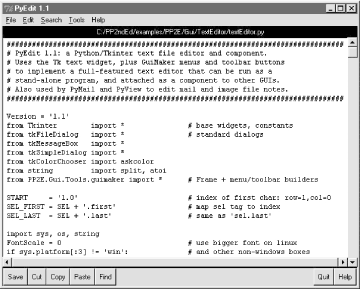 When run, this script makes a two-button window that triggers the message1 and message2 methods. Example 9-12 contains the actual callback handlers' code. Its functions receive a self argument that gives access back to the Hello class object, as though these were real methods. You can change this file any number of times while the rad script's GUI is active; each time you do so, you'll change the behavior of the GUI when a button press occurs. Example 9-12. PP2E\Gui\Tools\Reload\actions.py# callback handlers: reloaded each time triggered def message1( ): # change me print 'spamSpamSPAM' # could build a dialog... def message2(self): print 'Ni! Ni!' # change me self.method1( ) # access the 'Hello' instance... Try running rad and editing the messages printed by actions in another window; you should see your new messages printed in the stdout console window each time the GUI's buttons are pressed. This example is deliberately simple to illustrate the concept, but the actions reloaded like this in practice might build pop-up dialogs, new top-level windows, and so on. Reloading the code that creates such windows would also let us dynamically change their appearances. There are other ways to change a GUI while it's running. For instance, we saw in Chapter 8 that appearances can be altered at any time by calling the widget config method, and widgets can be added and deleted from a display dynamically with methods like pack_forget and pack (and their grid manager relatives). Furthermore, passing a new command=action option setting to a widget's config method might reset a callback handler to a new action object on the fly; with enough support code, this may be a viable alternative to the indirection scheme used above to make reloads more effective in GUIs. 9.3 Complete Program ExamplesThe rest of this chapter presents a handful of complete GUI programs, as examples of how far Python and Tkinter can take you. Because I've already shown the interfaces these scripts employ, this section is mostly screen shots, program listings, and a few bullets describing some of the most important aspects of these programs. In other words, this is a self-study section: read the source, run the examples on your own computer, and refer to the previous chapters for further details on the code listed here. Many of these scripts also are accompanied on the book CD by alternative or experimental implementations not listed here; see the CD for extra code examples. 9.4 PyEdit: A Text Editor Program/ObjectIn the last few decades, I've typed text into a lot of programs. Most were closed systems (I had to live with whatever decisions their designers made), and many ran on only one platform. The PyEdit program presented in this section does better on both counts: it implements a full-featured, graphical text editor program in roughly 470 lines of portable Python code (including whitespace and comments). Despite its size, PyEdit was sufficiently powerful and robust to serve as the primary tool used to code most examples in this book. PyEdit supports all the usual mouse and keyboard text-editing operations: cut and paste, search and replace, open and save, and so on. But really, PyEdit is a bit more than just another text editor -- it is designed to be used as both a program and a library component, and can be run in a variety of roles: Standalone mode As a standalone text editor program, with or without the name of a file to be edited passed in on the command line. In this mode, PyEdit is roughly like other text-editing utility programs (e.g., Notepad on Windows), but also provides advanced functions such as running Python program code being edited, changing fonts and colors, and so on. More importantly, because it is coded in Python, PyEdit is easy to customize, and runs portably on Windows, X Windows, and Macintosh. Pop-up mode Within a new pop-up window, allowing an arbitrary number of copies to appear as pop-ups at once in a program. Because state information is stored in class instance attributes, each PyEdit object created operates independently. In this mode and the next, PyEdit serves as a library object for use in other scripts, not a canned application. Embedded mode As an attached component, to provide a text- editing widget for other GUIs. When attached, PyEdit uses a frame-based menu, and can optionally disable some of its menu options for an embedded role. For instance, PyView (later in this chapter) uses PyEdit in embedded mode this way to serve as a note editor for photos, and PyMail (in Chapter 11) attaches it to get an email text editor for free. While such mixed-mode behavior may sound complicated to implement, most of PyEdit's modes are a natural by-product of coding GUIs with the class-based techniques we've seen in the last three chapters. 9.4.1 Running PyEditPyEdit sports lots of features, and the best way to learn how it works is to test drive it for yourself -- it can be run by starting the file textEditor.pyw, or from the PyDemo and PyGadget launcher bars described in the previous chapter (the launchers themselves live in the top level of the book examples directory tree). To give you a sampling of its interfaces, Figure 9-10 shows the main window's default appearance, after opening PyEdit's source code file. Figure 9-10. PyEdit main window, editing itself
