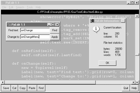 The main part of this window is a Text widget object, and if you read the last chapter's coverage of this widget, PyEdit text-editing operations will be familiar. It uses text marks, tags, and indexes, and implements cut-and-paste operations with the system clipboard so that PyEdit can paste data to and from other applications. Both vertical and horizontal scrollbars are cross-linked to the Text widget, to support movement through arbitrary files. If PyEdit's menu and toolbars look familiar, they should -- it builds the main window with minimal code and appropriate clipping and expansion policies, by mixing in the GuiMaker class we met earlier in this chapter. The toolbar at the bottom contains shortcut buttons for operations I tend to use most often; if my preferences don't match yours, simply change the toolbar list in the source code to show the buttons you want (this is Python, after all). As usual for Tkinter menus, shortcut key combinations can be used to invoke menu options quickly, too -- press Alt plus all the underlined keys of entries along the path to the desired action. PyEdit pops up a variety of modal and nonmodal dialogs, both standard and custom. Figure 9-11 shows the custom and nonmodal change dialog, along with a standard dialog used to display file statistics. Figure 9-11. PyEdit with colors, font, and a few pop-ups