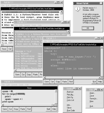 The main window here has been given new foreground and background colors (with the standard color selection dialog), and a new text font has been selected from a canned list in the script that users can change to suit their preferences (this is Python, after all). The standard file open and save selection dialogs in PyEdit use object-based interfaces to remember the last directory visited, so you don't have to renavigate there every time. One of the more unique features of PyEdit is that it can actually run Python program code that you are editing. This isn't as hard as it may sound either -- because Python provides built-ins for both compiling and running code strings and launching programs, PyEdit simply has to make the right calls for this to work. For example, it's easy to code a simple-minded Python interpreter in Python (though you need a bit more to handle multiple-line statements), as shown in Example 9-13. Example 9-13. PP2E\Gui\TextEditor\simpleshell.pynamespace= {}while 1: try:line = raw_input('>>> ') # single line statements only except EOFError: break else:exec line in namespace # or eval( ) and print result Depending on the user's preference, PyEdit either does something similar to this to run code fetched from the text widget, or uses the launchmodes module we wrote at the end of Chapter 3 to run the code's file as an independent program. There are a variety of options in both schemes that you can customize as you like (this is Python, after all). See the onRunCode method for details, or simply edit and run some Python code on your own. Figure 9-12 shows four independently started instances of PyEdit running with a variety of color schemes, sizes, and fonts. This figure also captures two PyEdit torn-off menus (lower right) and the PyEdit help pop-up (upper right). The edit windows' backgrounds are shades of yellow, blue, purple, and orange; use the Tools menu's Pick options to set colors as you like. Figure 9-12. Multiple PyEdit sessions at work
