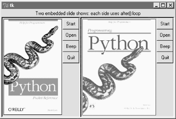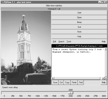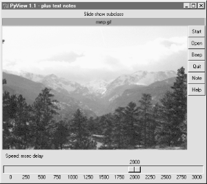 This makes for a very big window, usually best view maximized (taking up the entire screen). The main thing to notice, though, is the lower right corner of this display above the scale -- it's simply an attached PyEdit object, running the very same code listed in the prior section. Because PyEdit is implemented as a GUI class, it can be reused like this in any GUI that needs a text editing interface. When embedded like this, PyEdit's menus are based on a frame (it doesn't own the window at large), text content is stored and fetched directly, and some stand-alone options are omitted (e.g, the File pull-down is gone). The note file viewer only appears if you press the Note button, and it is erased if you press it again; PyView uses widget pack and pack_forget methods introduced at the end of the last chapter to show and hide the note viewer frame. The window automatically expands to accommodate the note viewer when it is packed and displayed. It is also possible to open the note file in a PyEdit pop-up window, but PyView embeds the editor to retain a direct visual association. Watch for PyEdit to show up embedded within another GUI like this when we meet PyMail in Chapter 11. A caveat here: out of the box, PyView supports as many photo formats as Tkinter's PhotoImage object does; that's why it looks for GIF files by default. You can improve this by installing the PIL extension to view JPEGs (and many others). But because PIL is an optional extension today, it's not incorporated into this PyView release. See the end of Chapter 7 for more on PIL and image formats. 9.5.2 PyView Source CodeBecause the PyView program was implemented in stages, you need to study the union of two files and classes to understand how it truly works. One file implements a class that provides core slideshow functionality; the other implements a class the extends the original class, to add additional features on top of the core behavior. Let's start with the extension class: Example 9-16 adds a set of features to an imported slideshow base class -- note editing, a delay scale and file label, etc. This is the file that is actually run to start PyView. Example 9-16. PP2E\Gui\SlideShow\slideShowPlus.py################################################################### # SlideShowPlus: add note files with an attached PyEdit object, # a scale for setting the slideshow delay interval, and a label # that gives the name of the image file currently being displayed; ################################################################### import os, string from Tkinter import * from PP2E.Gui.TextEditor.textEditor import * from slideShow import SlideShow #from slideShow_threads import SlideShow class SlideShowPlus(SlideShow): def __init__(self, parent, picdir, editclass, msecs=2000): self.msecs = msecs self.editclass = editclass SlideShow.__init__(self, parent=parent, picdir=picdir, msecs=msecs) def makeWidgets(self): self.name = Label(self, text='None', bg='red', relief=RIDGE) self.name.pack(fill=X) SlideShow.makeWidgets(self) Button(self, text='Note', command=self.onNote).pack(fill=X) Button(self, text='Help', command=self.onHelp).pack(fill=X) s = Scale(label='Speed: msec delay', command=self.onScale, from_=0, to=3000, resolution=50, showvalue=YES, length=400, tickinterval=250, orient='horizontal') s.pack(side=BOTTOM, fill=X) s.set(self.msecs)if self.editclass == TextEditorMain: # make editor now self.editor = self.editclass(self.master) # need root for menu else:self.editor = self.editclass(self) # embedded or popup self.editor.pack_forget( ) # hide editor initially self.editorUp = self.image = None def onStart(self): SlideShow.onStart(self) self.config(cursor='watch') def onStop(self): SlideShow.onStop(self) self.config(cursor='hand2') def onOpen(self): SlideShow.onOpen(self) if self.image: self.name.config(text=os.path.split(self.image[0])[1]) self.config(cursor='crosshair')self.switchNote( ) def quit(self):self.saveNote( ) SlideShow.quit(self) def drawNext(self): SlideShow.drawNext(self) if self.image: self.name.config(text=os.path.split(self.image[0])[1])self.loadNote( ) def onScale(self, value): self.msecs = string.atoi(value) def onNote(self):if self.editorUp: # if editor already open #self.saveNote( ) # save text, hide editor self.editor.pack_forget( ) self.editorUp = 0 else:self.editor.pack(side=TOP) # else unhide/pack editor self.editorUp = 1 # and load image note text self.loadNote( ) def switchNote(self): if self.editorUp:self.saveNote( ) # save current image's note self.loadNote( ) # load note for new image def saveNote(self): if self.editorUp:currfile = self.editor.getFileName() # or self.editor.onSave( ) currtext = self.editor.getAllText( ) # but text may be empty if currfile and currtext: try: open(currfile, 'w').write(currtext) except: pass # this may be normal if run off cd def loadNote(self): if self.image and self.editorUp: root, ext = os.path.splitext(self.image[0])notefile = root + '.note' self.editor.setFileName(notefile) try:self.editor.setAllText(open(notefile).read( )) except:self.editor.clearAllText( ) def onHelp(self): showinfo('About PyView','PyView version 1.1\nJuly, 1999\n' 'An image slide show\nProgramming Python 2E')if __name__ == '__main__': import sys picdir = '../gifs' if len(sys.argv) >= 2: picdir = sys.argv[1] editstyle = TextEditorComponentMinimal if len(sys.argv) == 3: try: editstyle = [TextEditorMain, TextEditorMainPopup, TextEditorComponent, TextEditorComponentMinimal][string.atoi(sys.argv[2])] except: passroot = Tk( ) root.title('PyView 1.1 - plus text notes')Label(root, text="Slide show subclass").pack( ) SlideShowPlus(parent=root, picdir=picdir, editclass=editstyle)root.mainloop( ) The core functionality extended by SlideShowPlus lives in Example 9-17. This was the initial slideshow implementation; it opens images, displays photos, and cycles through a slideshow. You can run it by itself, but you won't get advanced features like notes and sliders added by the SlideShowPlus subclass. Examp