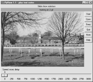 Though it's not obvious as rendered in this book, the black-on-red label at the top gives the pathname of the photo file displayed. For a good time, move the slider at the bottom all the way over to "0" to specify no delay between photo changes, and click Start to begin a very fast slideshow. If your computer is at least as fast as mine, photos flip by much too fast to be useful for anything but subliminal advertising. Slideshow photos are loaded on startup to retain references to them (remember, you must hold on to image objects). But the speed with which large GIFs can be thrown up in a window in Python is impressive, if not downright exhilarating. The GUI's Start button changes to a Stop button during a slideshow (its text attribute is reset with the widget config method). Figure 9-14 shows the scene after pressing Stop at an opportune moment. Figure 9-14. PyView after stopping a slideshow