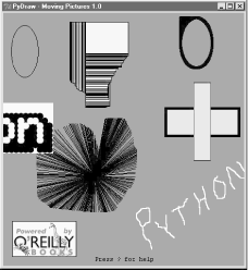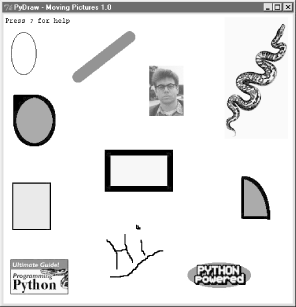 The simple slideShow_frames scripts attach two instances of SlideShow to a single window -- a feat possible only because state information is recorded in class instance variables, not globals. The slideShow_toplevels script also on the CD attaches two SlideShows to two top-level pop-up windows instead. In both cases, the slideshows run independently, but are based on after events fired from the same single event loop in a single process. 9.6 PyDraw: Painting and Moving GraphicsThe previous chapter introduced simple Tkinter animation techniques (see the tour's canvasDraw variants). The PyDraw program listed here builds upon those ideas to implement a more feature-rich painting program in Python. It adds new trails and scribble drawing modes, object and background color fills, embedded photos, and more. In addition, it implements object movement and animation techniques -- drawn objects may be moved around the canvas by clicking and dragging, and any drawn object can be gradually moved across the screen to a target location clicked with the mouse. 9.6.1 Running PyDrawPyDraw is essentially a Tkinter canvas with lots of keyboard and mouse event bindings to allow users to perform common drawing operations. This isn't a professional-grade paint program by any definition, but it's fun to play with. In fact, you really should -- it is impossible to capture things like object motion in the medium afforded by this book. Start PyDraw from the launcher bars (or run the file movingpics.pyfrom Example 9-18 directly). Press the ? key to view a help message giving available commands (or read the help string in the code listings). Figure 9-17 shows PyDraw after a few objects have been drawn on the canvas. To move any object shown here, either click it with the middle mouse button and drag to move it with the mouse cursor, or middle-click the object and then right-click in the spot you want it to move towards. In the latter case, PyDraw performs an animated (gradual) movement of the object to the target spot. Try this on the picture of Python creator Guido van Rossum near the top to start the famous "Moving Guido Demo" (yes, he has a sense of humor, too). Figure 9-17. PyDraw with draw objects ready to be moved