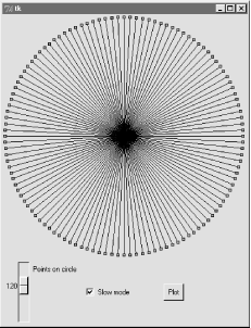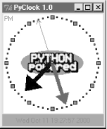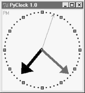 For more help, the book CD also includes text-based versions of this plotting script that print circle point coordinates to the stdout stream for review, rather than rendering them in a GUI. See the plotterText scripts in the clock's directory. Here is the sort of output they produce when plotting 4 and 12 points on a circle that is 400 points wide and high; the output format is simply: pointnumber : angle = (Xcoordinate, Ycoordinate) and assumes that the circle is centered at coordinate (0,0): ---------- 1 : 90.0 = (200, 0) 2 : 180.0 = (0, -200) 3 : 270.0 = (-200, 0) 4 : 360.0 = (0, 200) ---------- 1 : 30.0 = (100, 173) 2 : 60.0 = (173, 100) 3 : 90.0 = (200, 0) 4 : 120.0 = (173, -100) 5 : 150.0 = (100, -173) 6 : 180.0 = (0, -200) 7 : 210.0 = (-100, -173) 8 : 240.0 = (-173, -100) 9 : 270.0 = (-200, 0) 10 : 300.0 = (-173, 100) 11 : 330.0 = (-100, 173) 12 : 360.0 = (0, 200) ---------- To understand how these points are mapped to a canvas, you first need to know that the width and height of a circle are always the same -- the radius x 2. Because Tkinter canvas (X,Y) coordinates start at (0,0) in the upper left corner, the plotter GUI must offset the circle's center point to coordinates (width/2, width/2) -- the origin point from which lines are drawn. For instance, in a 400-by-400 circle, the canvas center is (200,200). A line to the 90-degree angle point on the right side of the circle runs from (200,200) to (400,200) -- the result of adding the (200,0) point coordinates plotted for the radius and angle. A line to the bottom at 180 degrees runs from (200,200) to (200,400) after factoring in the (0,-200) point plotted. This point-plotting algorithm used by plotterGui, along with a few scaling constants, is at the heart of the PyClock analog display. If this still seems a bit much, I suggest you focus on the PyClock script's digital display implementation first; the analog geometry plots are really just extensions of underlying timing mechanisms used for both display modes. In fact, the clock itself is structured as a generic Frame object that embeds digital and analog display objects, and dispatches time change and resize events to both the same way. The analog display is an attached Canvas that knows how to draw circles, but the digital object is simply an attached Frame with labels to show time components. 9.7.2 Running PyClockApart from the circle geometry bit, the rest of PyClock is straightforward. It simply draws a clock face to represent the current time and uses widget after methods to wake itself up 10 times per second to check if the system time has rolled over to the next second. On second rollovers, the analog second, minute, and hour hands are redrawn to reflect the new time (or the text of the digital display's labels is changed). In terms of GUI construction, the analog display is etched out on a canvas, is redrawn whenever the window is resized, and changes to a digital format upon request. PyClock also puts Python's standard time module into service to fetch and convert system time information as needed for a clock. In brief, the onTimer method gets system time with time.time, a built-in tool that returns a floating-point number giving seconds since the "epoch" -- the point from which your computer counts time. The time.localtime call is then used to convert epoch time into a tuple that contains hour, minute, and second values; see the script and Python library manual for additional time-related call details. Checking the system time 10 times per second may seem intense, but it guarantees that the second hand ticks when it should without jerks or skips (after events aren't precisely timed), and is not a significant CPU drain on systems I use.[4] On Linux and Windows, PyClock uses negligible processor resources, and what it does use is spent largely on screen updates in analog display mode, not after events. To minimize screen updates, PyClock redraws only clock hands on second rollovers; points on the clock's circle are redrawn at startup and on window resizes only. Figure 9-20 shows the default initial PyClock display format you get when file clock.py is run directly. Figure 9-20. PyClock default analog display