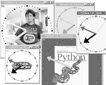 The image in the middle of Figure 9-22 is added by passing in a configuration object with appropriate settings to the PyClock object constructor. In fact, almost everything about this display can be customized with attributes in PyClock configuration objects -- hand colors, clock tick colors, center photos, and initial size. Because PyClock's analog display is based upon a manually sketched figure on a canvas, it has to process window resize events itself: whenever the window shrinks or expands, the clock face has to be redrawn and scaled for the new window size. To catch screen resizes, the script registers for the <Configure> event with bind; surprisingly, this isn't a top-level window manager event like the close button. As you expand a PyClock, the clock face gets bigger with the window -- try expanding, shrinking, and maximizing the clock window on your computer. Because the clock face is plotted in a square coordinate system, PyClock always expands in equal horizontal and vertical proportions, though; if you simply make the window only wider or taller, the clock is unchanged. Finally, like PyEdit, PyClock can be run either standalone or attached to and embedded in other GUIs that need to display the current time. To make it easy to start preconfigured clocks, a utility module called clockStyles provides a set of clock configuration objects you can import, subclass to extend, and pass to the clock constructor; Figure 9-23 shows a few of the preconfigured clock styles and sizes in action, ticking away in sync. Figure 9-23. A few canned clock styles (Guido's photo reprinted with permission from Dr. Dobb's Journal)