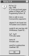 Figure 9-25 shows PyToe's help pop-up dialog, which lists its command-line configuration options. You can specify colors and font sizes for board labels, the player who moves first, the mark of the user ("X" or "O"), the board size (to override the 3-by-3 default), and the move selection strategy for the computer (e.g., "Minimax" performs a move tree search to spot wins and losses, and "Expert1" and "Expert2" use static scoring heuristics functions). Figure 9-25. PyToe help pop-up with options info