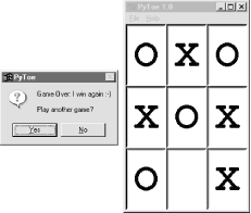 The AI gaming techniques used in PyToe are CPU-intensive, and some computer move selection schemes take longer than others, but their speed varies mostly with the speed of your computer. Move selection delays are fractions of a second long on my 650 MHz machine for a 3-by-3 game board, for all "-mode" move-selection strategy options. Figure 9-26 shows an alternative PyToe configuration just after it beat me. Despite the scenes captured for this book, under some move selection options, I do still win once in awhile. In larger boards and more complex games, PyToe's move selection algorithms become even more useful. Figure 9-26. an alternative layout